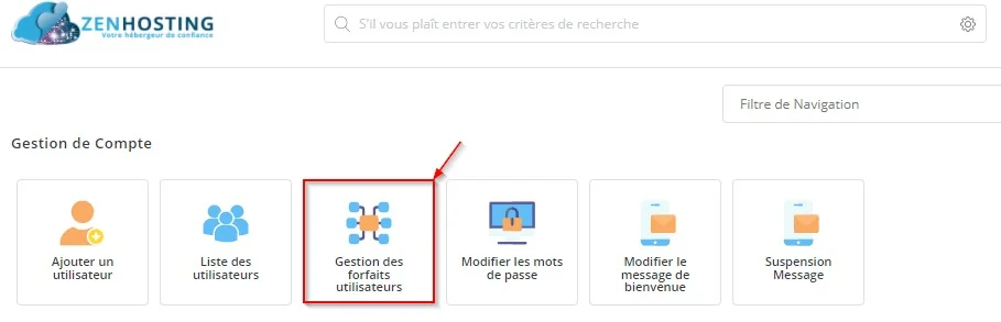 Accédez à Gestion de Compte >> Gestion des forfaits Utilisateurs
