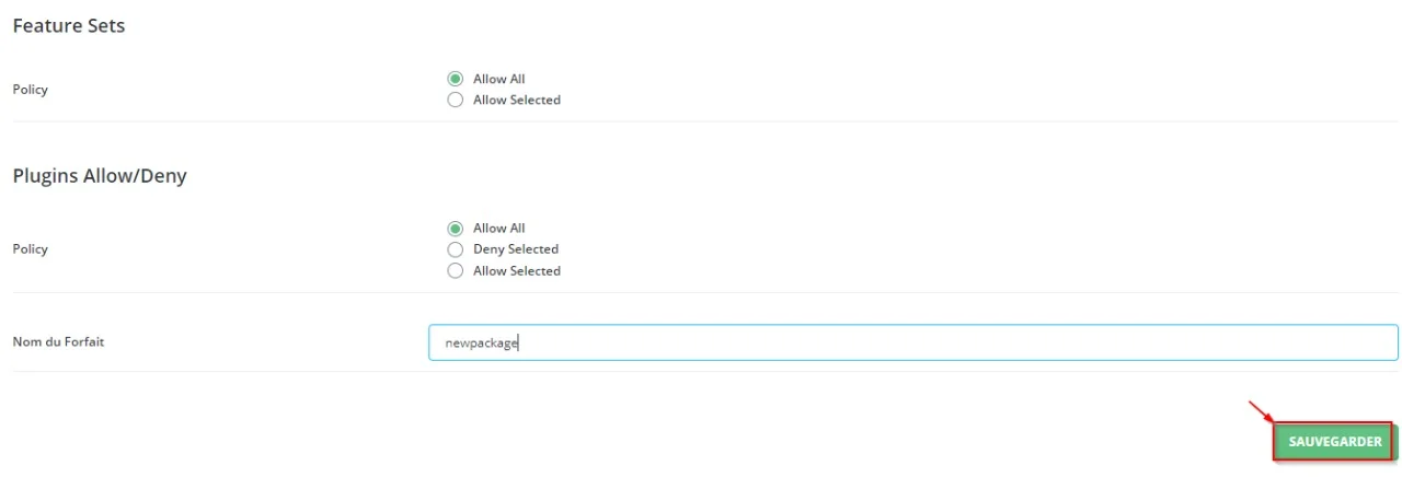 Sur la dernière ligne, entrez le nom du package souhaité et appuyez sur le bouton “Sauvegarder”. Vous verrez le nouveau package dans la liste des packages de serveur.